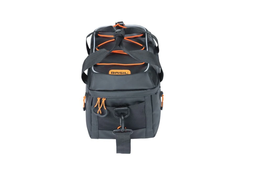 Die Basil Miles Tarpaulin Gepäckträgertasche MIK ist eine schwarze Tasche für echte Sportfans. Sie ist aus robustem, wasserdichtem Tarpaulin und extrem vielseitig einsetzbar. Die Tasche ist schwarz, trägt aber sportliche Akzente in Orange. Du kannst diese Tasche nicht nur auf dem Gepäckträger befestigen, sondern auch bequem über der Schulter mitnehmen. Die Trunkbag hat einen abnehmbaren Schulterriemen und praktische Griffe. Die Tasche hat ein Volumen von 7 Litern, das sich auf mehrere Innenfächer verteilt. Einige Fächer sind gepolstert, damit du Sachen wie eine Kamera oder ein Telefon gut geschützt mitnehmen kannst. Oben an der Tasche ist ein zusätzliches Netz. Darin kannst du zum Beispiel eine Wasserflasche oder eine Regenjacke mitnehmen.