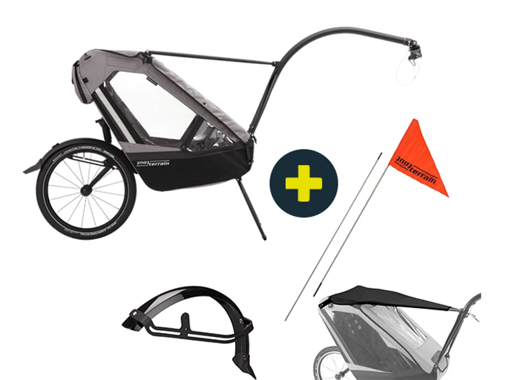 Der Singletrailer II Touring ist serienmäßig mit Fahne, Schutzblech und Sonnenverdeck ausgestattet. Damit bist du auch für den Alltag im Straßenverkehr bestens gewappnet.